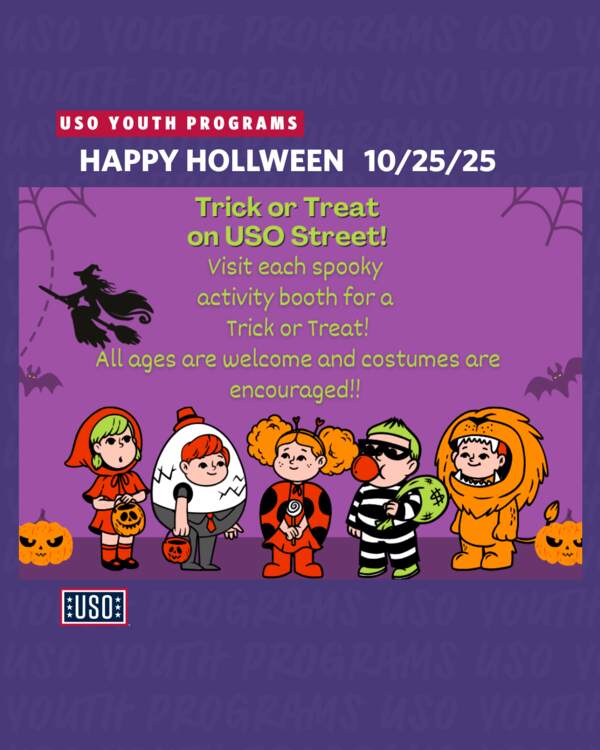Trick or Treat USO Street, calling all Goblins and Ghoul, Prince and Princess, join the USO Staff and volunteers for an evening of fun at Ft. Carson USO center and enjoy some fun games and activities that are bound to get the old bones rattling!