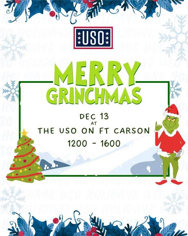 Celebrate the Holidays with USO at our Ft. Carson USO center. Visit our very own USOVille and the ‘Mean One’ himself and have a very Merry Grinchmas! Join us for activities, snacks, crafts, stories and plenty of holiday cheer for all to hear!
