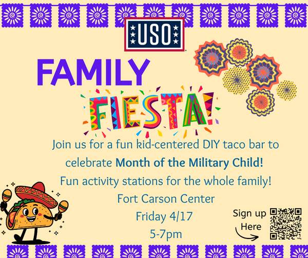 Join USO Colorado for Kids in the Kitchen: Month of the Military Child Fiesta! We will have a taco and nacho bar for kids and their families to come make their own creations! Enjoy family time together and let us do the cooking and clean up!