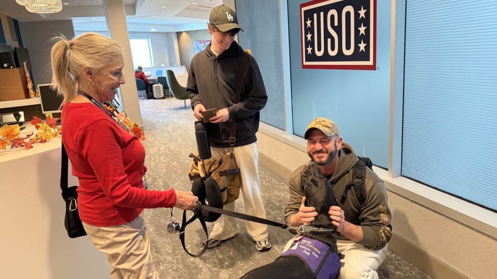 Meet Jed and his owner, Marti, beloved regulars at the USO Center at Denver International Airport. Jed happily greets every guest who walks through the door, offering calm companionship to anxious travelers and a friendly presence to anyone needing a moment of comfort.
